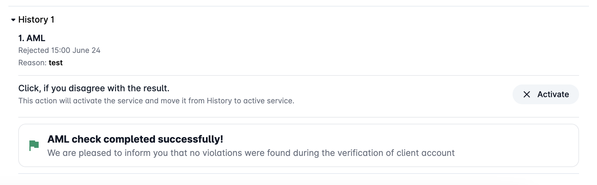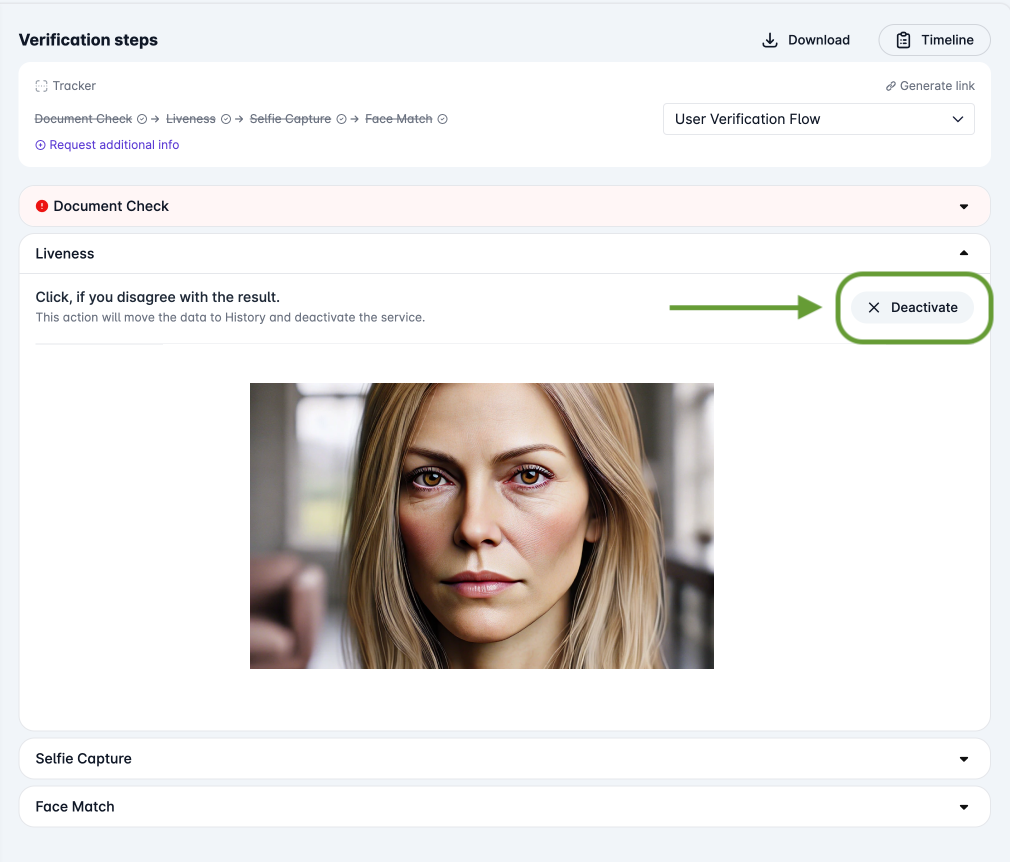 * When a reviewer identifies an issue or disagrees with the results presented by the verification step, they can deactivate the service instantly. This is done by clicking the `Deactivate` button located at the top right corner of the respective section: